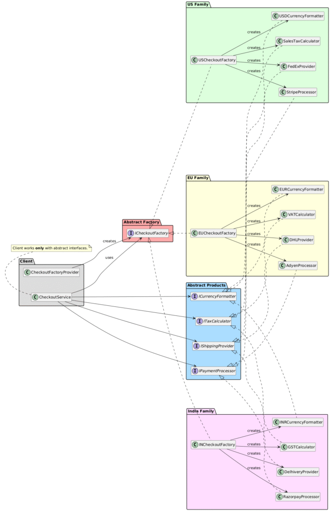The Abstract Factory pattern ensures regional consistency, global scalability, and clean separation of concerns — making it a cornerstone of enterprise e-commerce architectures.