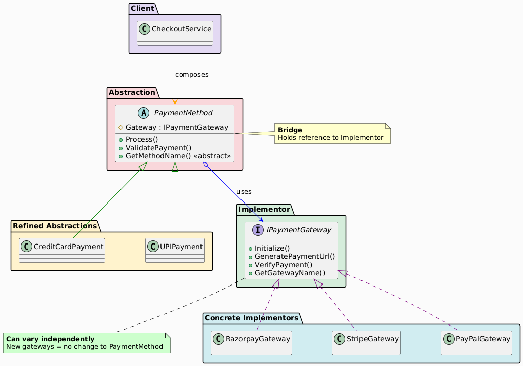 The Bridge pattern is perfect for e-commerce when you have two or more independent dimensions (payment method × gateway, theme × renderer, device × protocol). It prevents class explosion and allows full runtime flexibility.