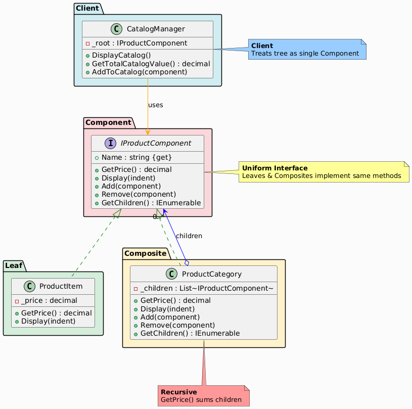 This pattern enables transparent recursion over hierarchical data, where leaves and composites are interchangeable.