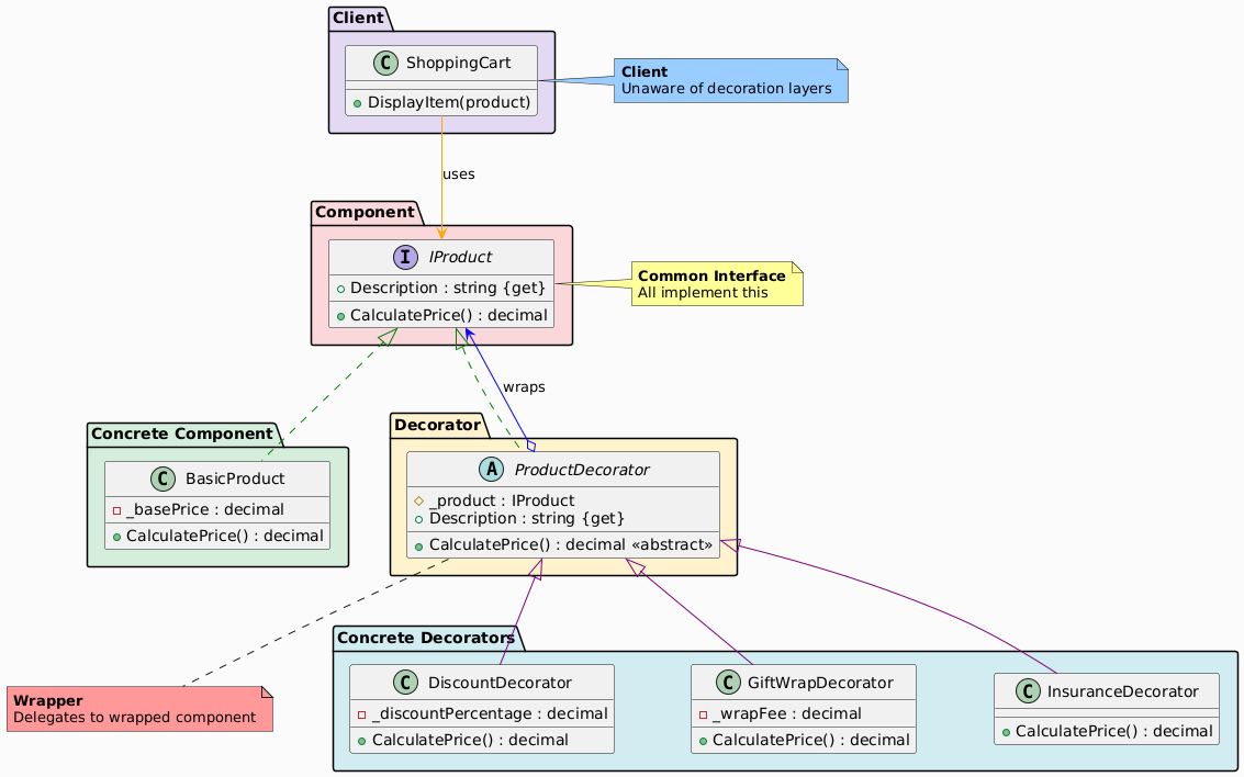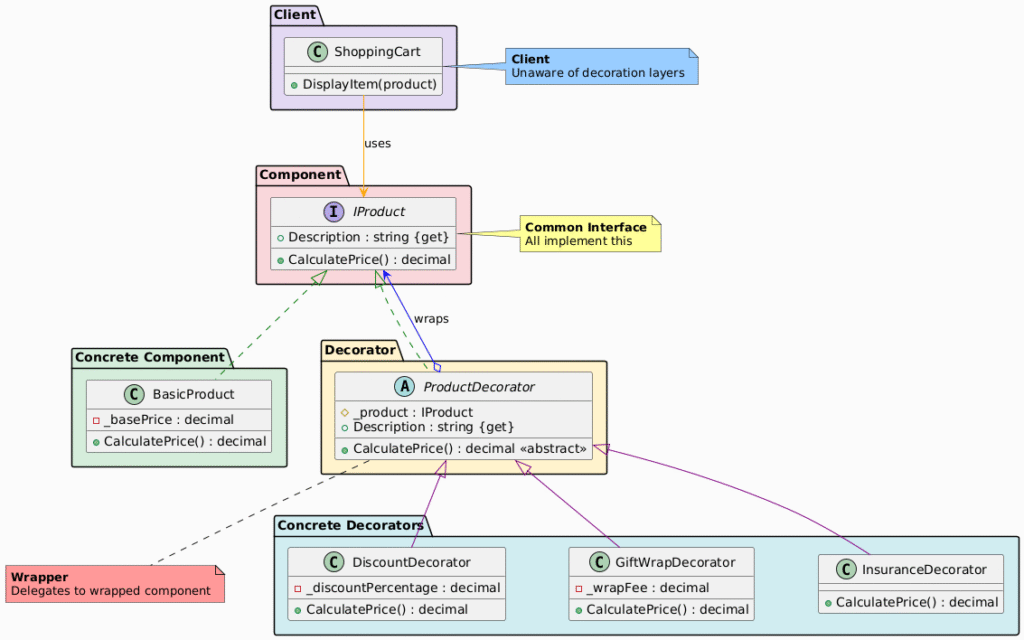 - ConcreteDecorator (DiscountDecorator, GiftWrapDecorator, InsuranceDecorator)