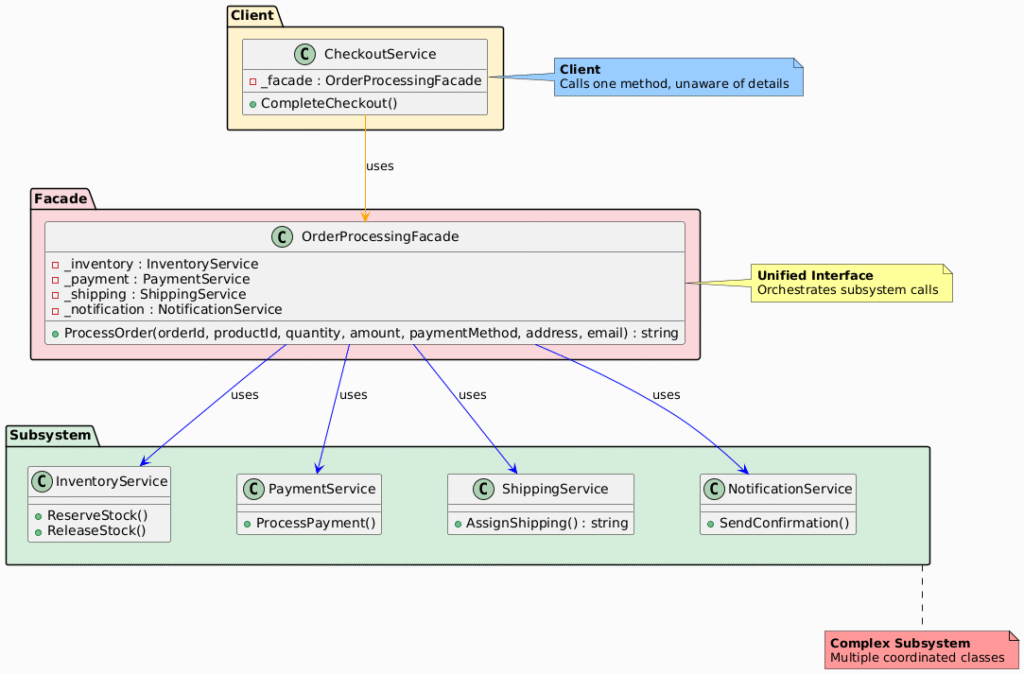 Console.WriteLine($"[Facade] Order {orderId} processed successfully");