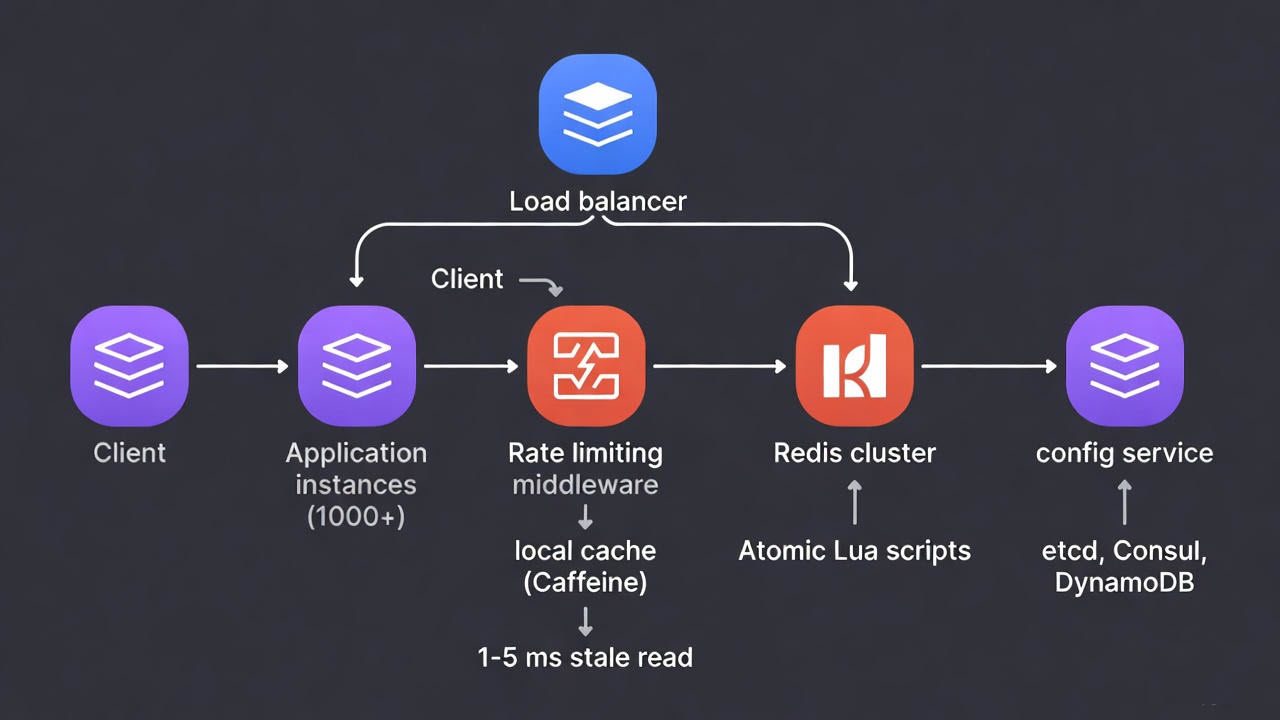 The system must solve the distributed counting problem while adding negligible latency. Modern designs (Cloudflare, Stripe, AWS API Gateway as of 2025) overwhelmingly favor a hybrid approach: a fast centralized store (Redis Cluster) for atomic updates + optional local caching for sub-millisecond decisions.