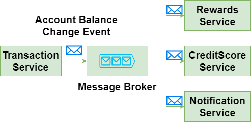 In this pattern, services exchange meaningful messages with each other through what are called commands or integration events. They are sent over message transports such as RabbitMQs, MSMQs, or Azure Service Bus. In the example above, the transactions service generates an “account balance changed” event and puts it on a message broker. The rewards service, credit score service, and notification service each subscribe to that event and react to it as necessary. This is a publish-subscribe pattern, and there are plenty of other useful patterns for messaging. Enterprise Integration Patterns is an excellent resource for learning more.